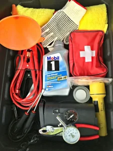 دستهبندی اقلام: ابزارهای پرکاربرد (مانند جک و آچار) باید به راحتی در دسترس باشند (مثلاً زیر صندلیها یا در دسترسترین قسمت صندوق عقب). قطعات یدکی کوچکتر باید در جعبههای پلاستیکی مشخص و مقاوم قرار گیرند.